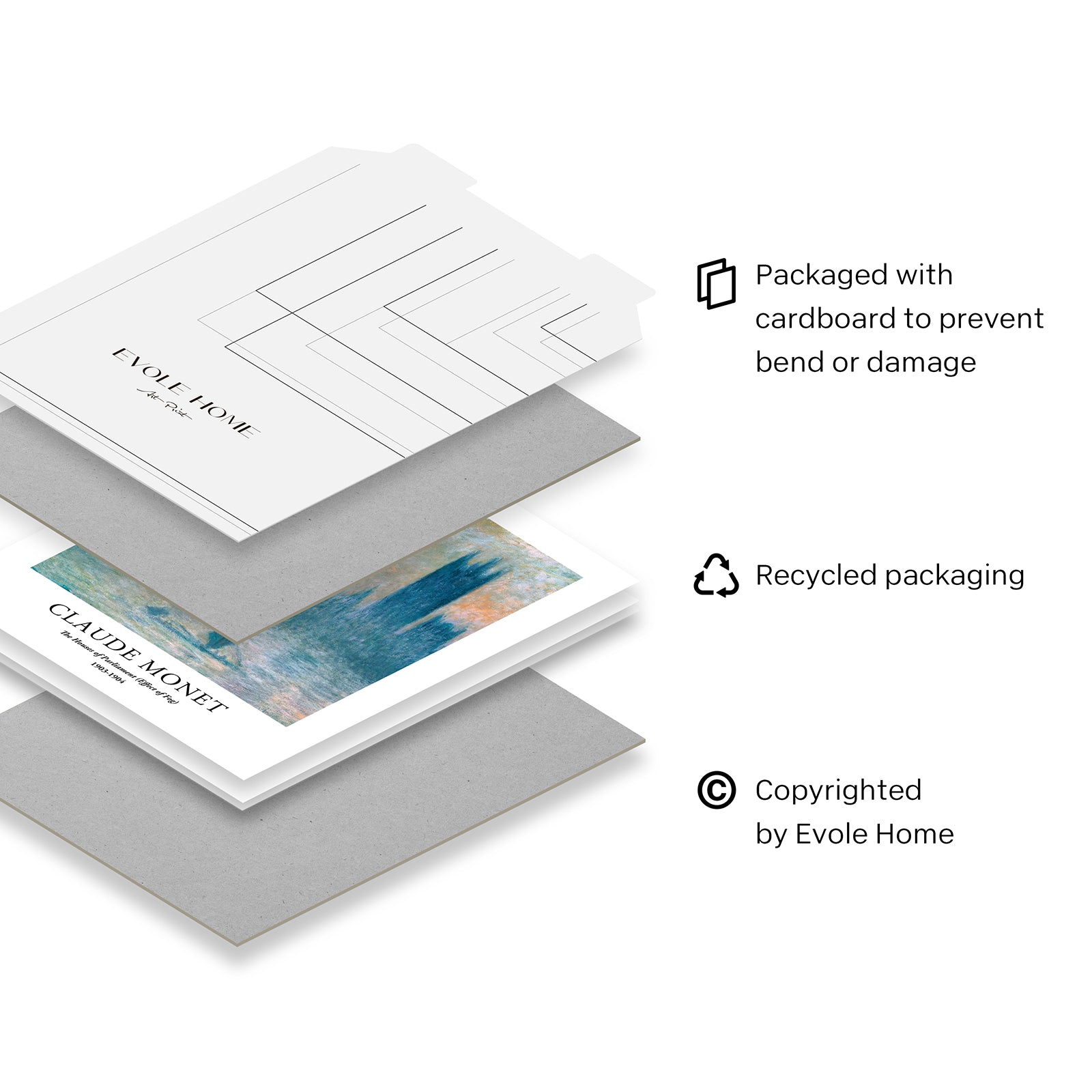Sus impresiones artísticas se empaquetan en un sobre resistente y plano para evitar dobleces o daños durante el transporte.